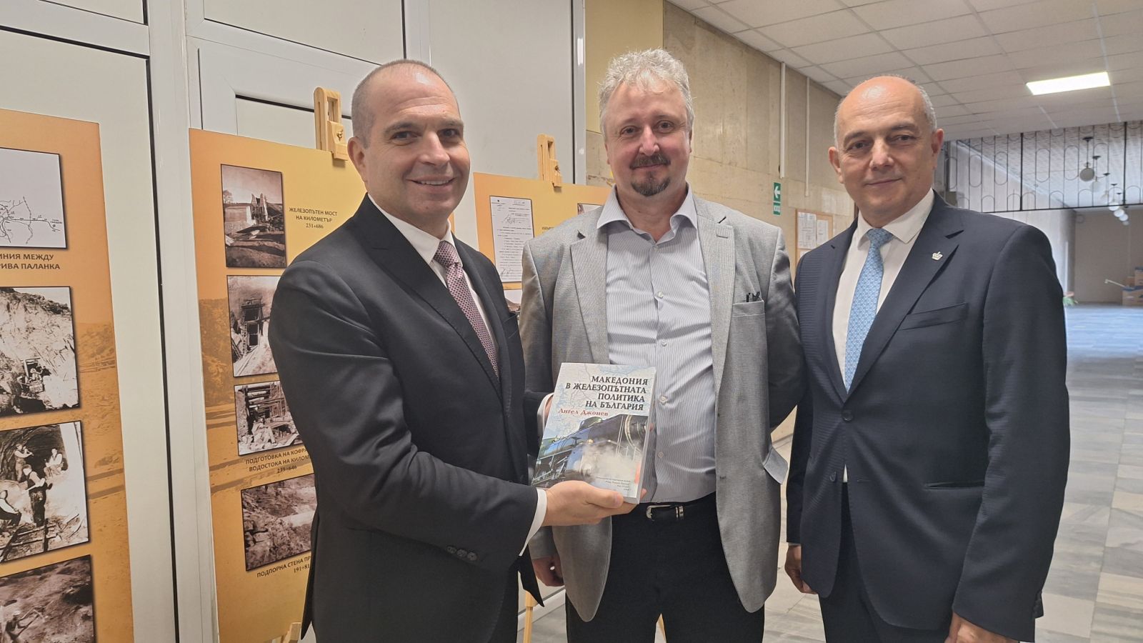 Председателят на КТПП Ваньо Костадинов подари книгата „Македония в железопътната политика на България“ на министър Гроздан Караджов, в присъствието на автора доц. Джонев, който лично я подписа.