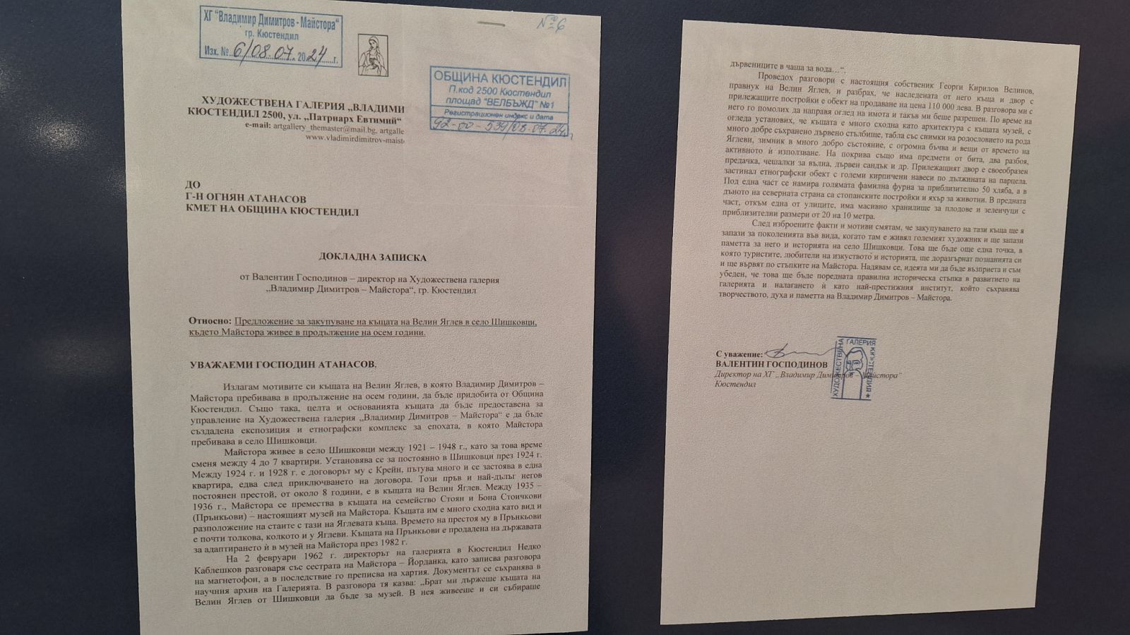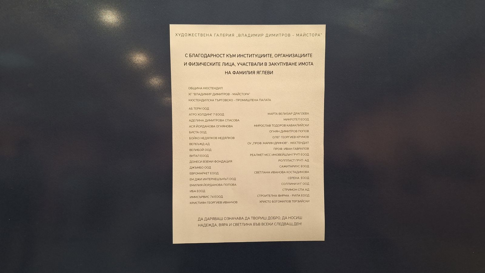 Съвместно с Художествена галерия „Владимир Димитров – Майстора“ и Община Кюстендил на 26 март 2026 г. бе организирана тържествена церемония, на която бяха връчени благодарствени адреси на дарителите и всички, допринесли за осигуряването на средствата за закупуването на имота на фамилия Яглеви в село Шишковци.